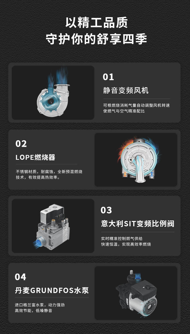 行業(yè)*預(yù)全混燃燒冷凝技術(shù),達(dá)到國(guó)家一級(jí)能效,有效回收潛熱熱效率高達(dá)106%,NOX達(dá)國(guó)標(biāo)新五級(jí)標(biāo)準(zhǔn),全密閉負(fù)壓燃燒,運(yùn)行噪音小于45db,21重安全保護(hù)功能,全方位監(jiān)控運(yùn)行狀況,安全無(wú)憂。